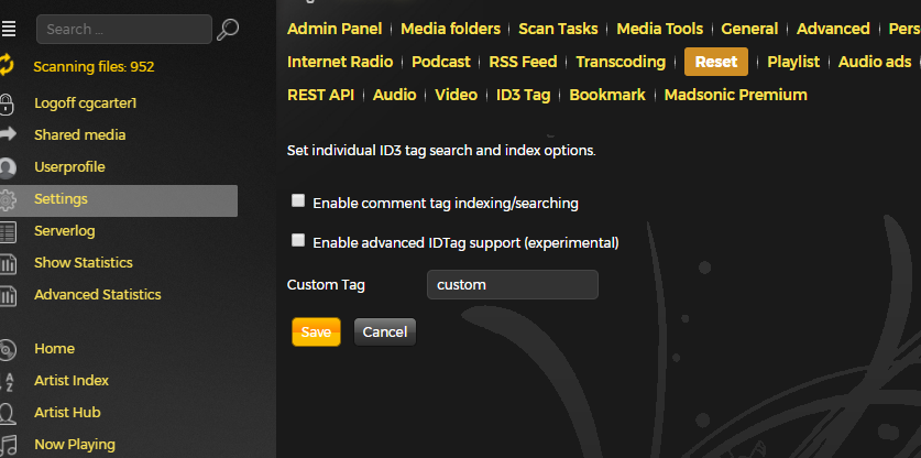 On the web version | Settings | ID3Tag it shows the Reset admin menu option as the active page instead of the ID3Tag page.