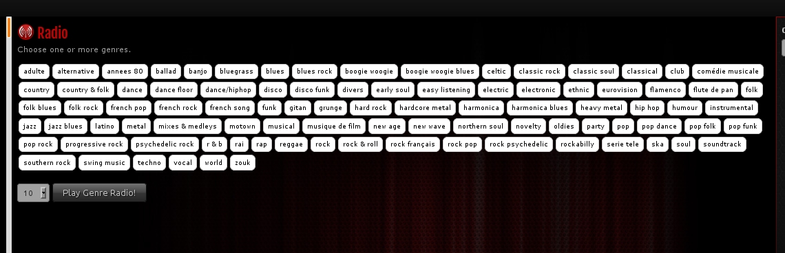 Hello, I have 91 music genres, by clicking on "Radio" button I can see all genres