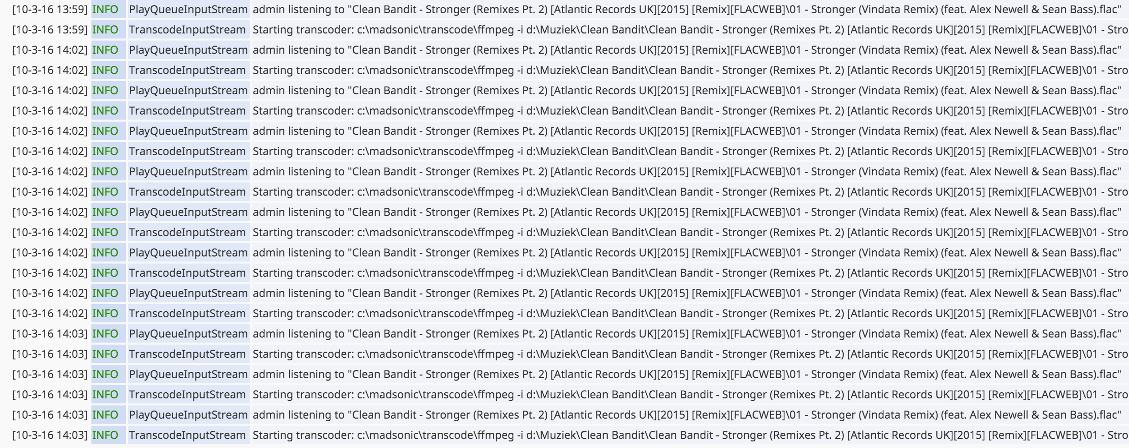 [2016-02-05 14:09:09,309] INFO TranscodeInputStream - Starting transcoder: [/var/madsonic/transcode/ffmpeg] [-i] [/mp3/Motörhead/We Are Motörhead/07 - Motörhead - One More Fucking Time.flac] [-map] [0:0] [-b:a] [192k] [-v] [0] [-f] [mp3] [-]